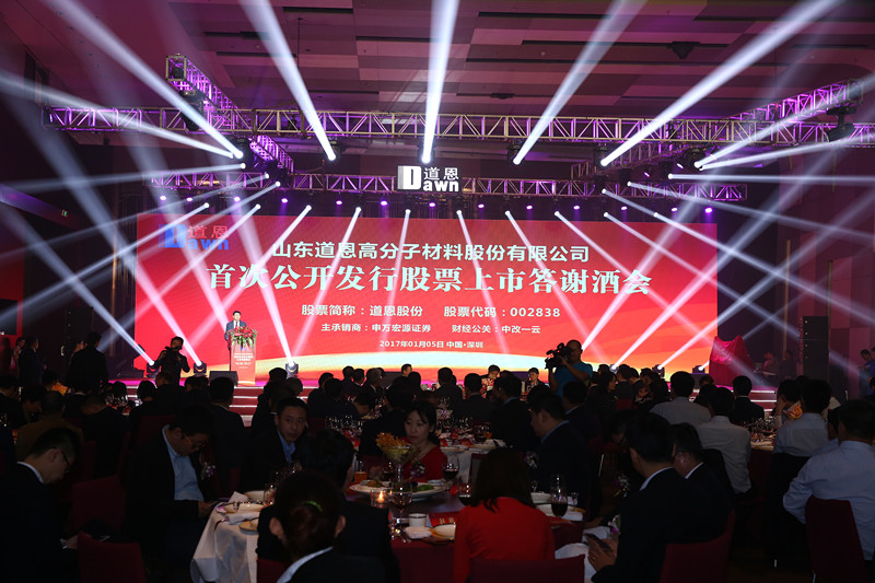 上市前夕的5日晚上,道恩股份在深圳君悅酒店隆重舉行上市答謝酒會。