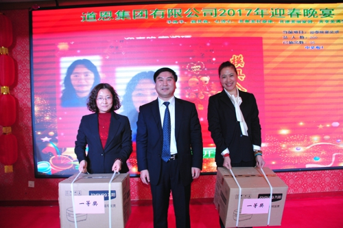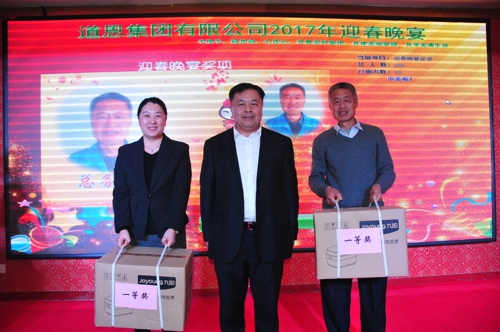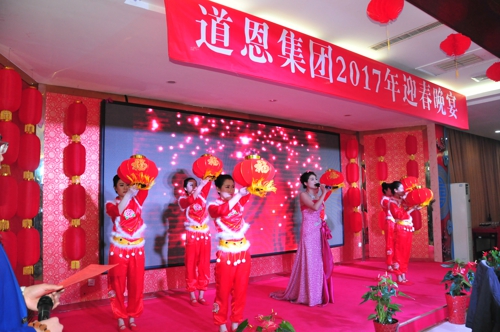 1月18日晚,主題為“共舞·共建·共享——感恩、超越”的道恩集團2017年迎春晚宴,在道恩湖畔酒店二樓多功能廳隆重舉行,集團公司董事長于曉寧、總裁索延輝出席晚宴,正科長以上干部200余人參加晚宴。