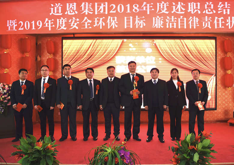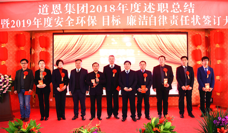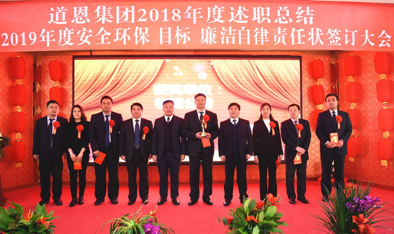 1月19日,道恩集團2018年度述職總結暨2019年度安全環保、目標、廉潔自律責任狀簽訂大會,在道恩湖畔酒店二樓多功能廳隆重召開,道恩集團董事長于曉寧、總裁索延輝出席會議并發表講話,道恩集團領導班子成員及各職能部門、經營單位正科級以上干部近300人參加會議。