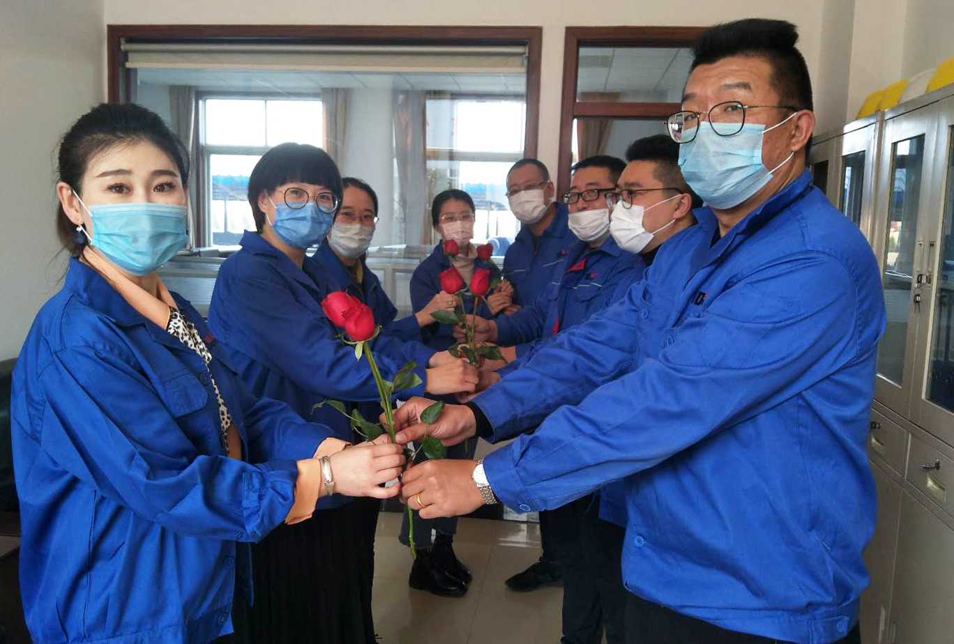 節日前夕,從集團公司總部到各職能部門,再到各經營單位,管理層親手把禮物送到女員工的手中,把深情的祝福送到大家心坎上。潤禾公司還組織了女員工座談會,對大家表示慰問和祝福。“鮮花祝福你們永遠年輕,口罩寓意大家身體健康,山楂預示著紅紅火火的未來,祝大家‘女神節’快樂!”道恩集團副總裁王永放親切的話語,讓女員工感到春天般的溫暖。