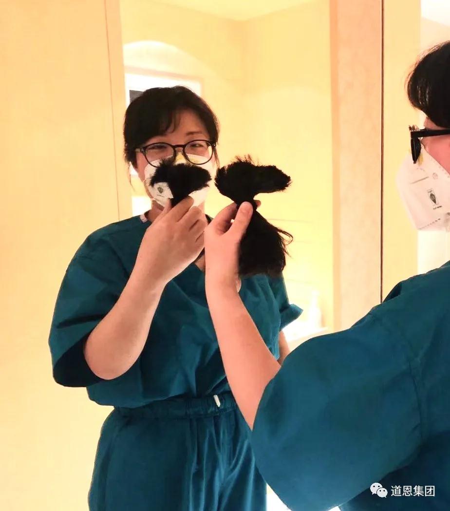 抵達武漢后,鄭俊博被分配到同濟醫院中法院區病房工作。這里的患者都是危重癥患者,病情變化快、感染風險高,為了杜絕感染風險,她剪掉了一頭長發,沒有一絲怨言。“我要加油,大寶還等著我打敗病毒回家,帶他們出去玩呢”。鄭俊博樸素的話語中,蘊藏著無限的勇氣。