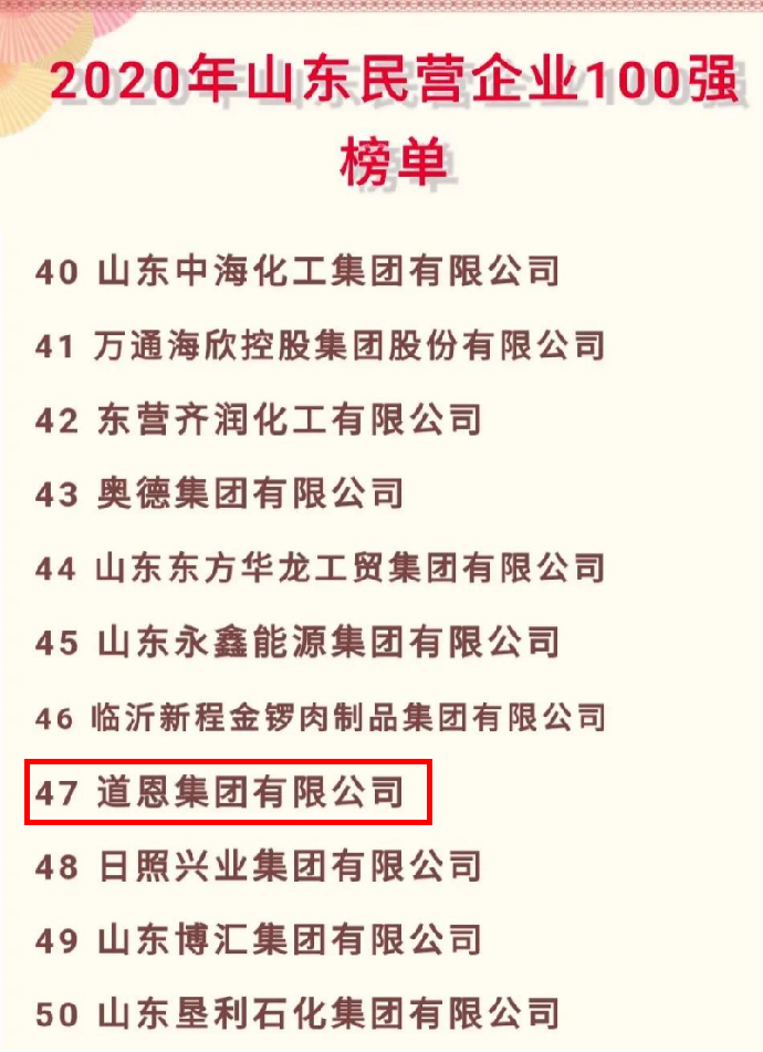 日前,道恩集團上榜2020年山東民營企業100強,位列47名,較去年提升了11個位次。這是道恩第7次上榜,逐年提升的排名位次,是企業高質量發展的有力證明。