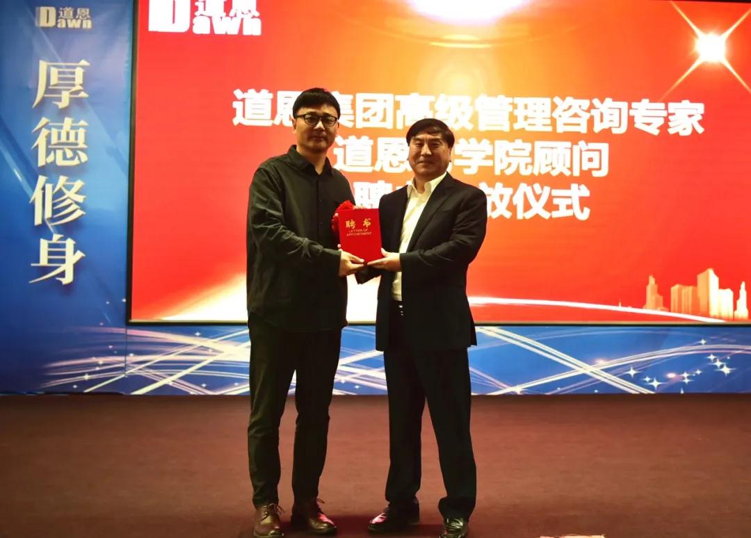 道恩集團董事長、道恩商學院院長于曉寧等領導共同為道恩商學院揭牌后,進入聘任環節。道恩集團、道恩商學院聘任尚峰老師為“道恩集團高級管理咨詢專家”、“道恩商學院高級顧問”,同時頒發了內部講師聘書和首批授課講師、課程開發師津貼。