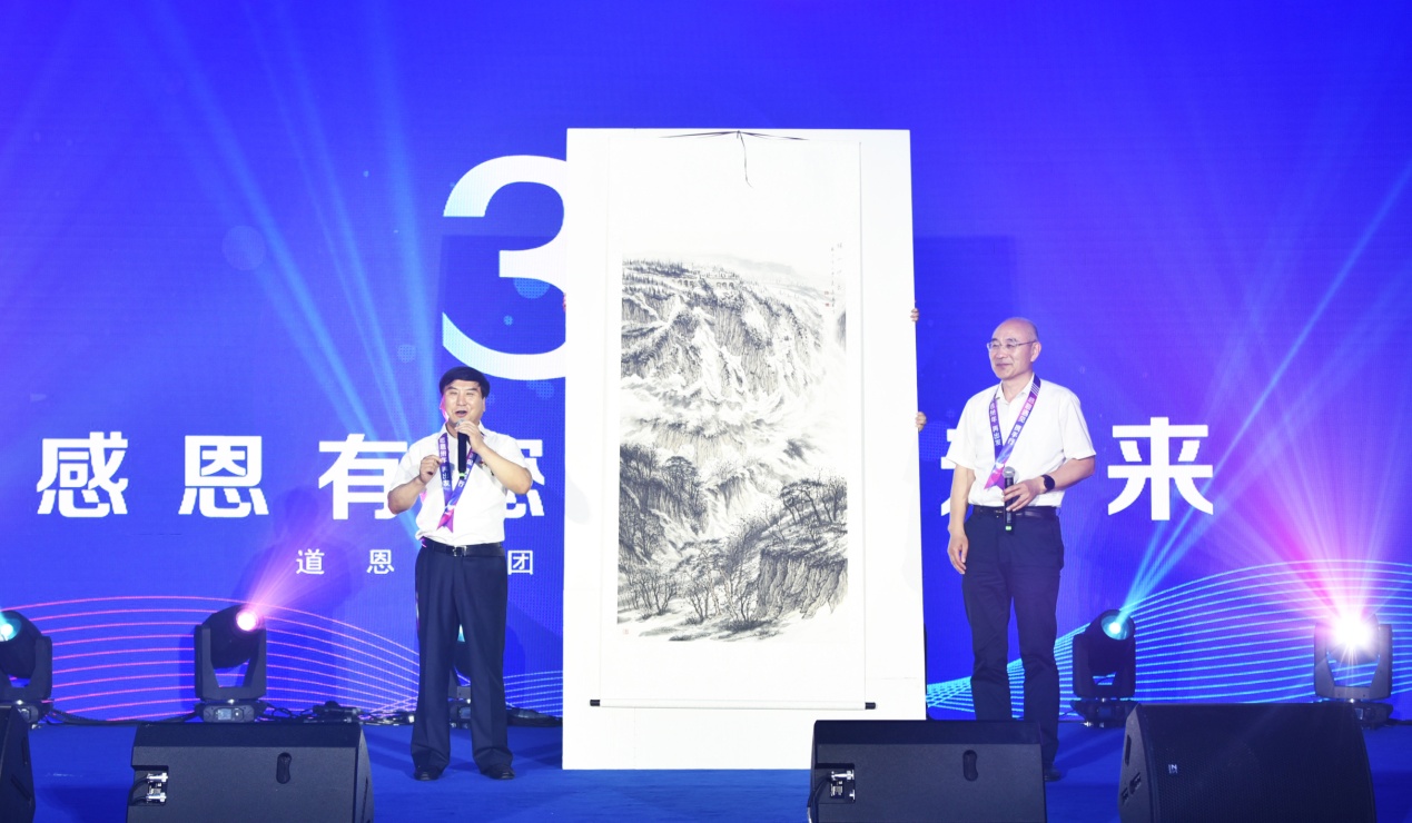 隨后,主持人宣讀了中石油、中石化等國內知名客戶以及浙江大學等高校發來的賀電與賀信。在活動現場,青島科技大學校長陳克正帶來了一份特殊的禮物——《驪山印象》圖。“從畫中可以看到,山氣勢磅礴,層巒疊嶂,高聳入云,林木遍野;寓意著道恩背靠青山,事業穩固;山水相間,財源滾滾。”主持人如是介紹。