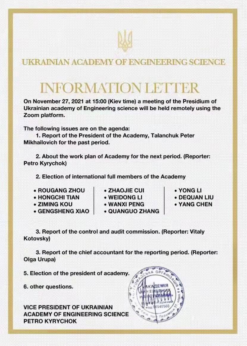11月27日晚上,烏克蘭國家工程院主席團會議宣布了2021年度當選院士名單,道恩股份總經理田洪池博士當選為烏克蘭國家工程院外籍院士,這是山東煙臺首位來自民營企業的院士。據悉,與田洪池一同當選的,還有國內高校、企業的其他10位學者。