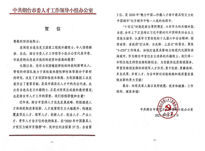 “此次您當選烏克蘭外籍院士,正是對您突出成就的最好褒獎,也是煙臺市人才工作的榮譽,我們倍感驕傲和自豪!”賀信飽含著煙臺市委、市政府對田洪池院士的祝福與關心,“作為煙臺市首位自主培養的外籍院士,我們將一如既往地支持您在煙創新創業,為您提供優質高效服務。”