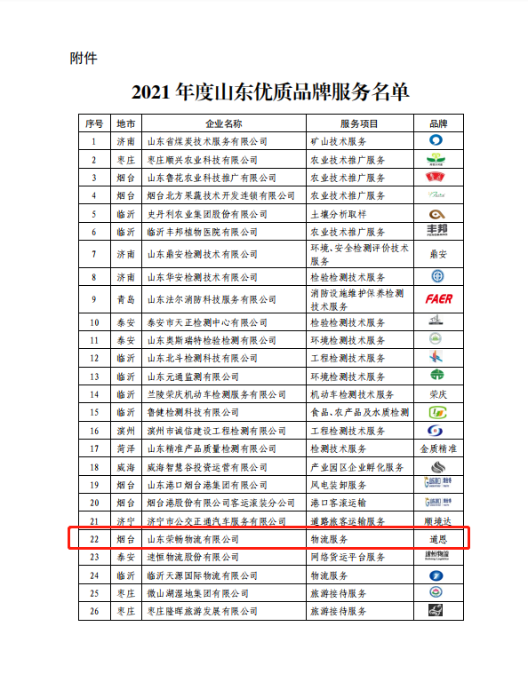 12月20日,2021年山東知名品牌認定名單正式公布,道恩集團旗下山東榮暢物流有限公司的“道恩”品牌“物流服務”項目入圍“山東優質品牌服務名單”。這是繼2019年獲得“山東知名品牌”以來,該公司再次獲評品牌榮譽,進一步彰顯了道恩品牌影響力。