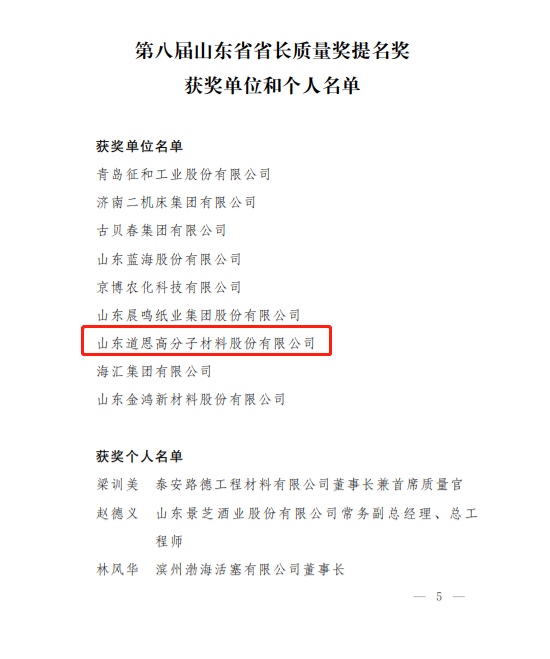 12月27日,山東省人民政府公布了第八屆山東省省長質量獎及提名獎獲獎單位和個人,道恩股份榮獲省長質量獎提名獎,標志著該公司高質量發展取得階段性成果。