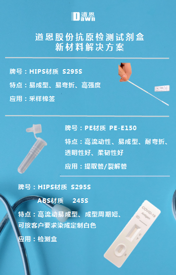 抗原檢測中最重要的一環,是將提取管中的混合液滴入檢測卡中。“我們推薦客戶使用HIPS-S295S、ABS-245S試劑卡專用料,由于材料具有高成型流動性,可以縮短成型周期,提高生產效率和敏捷性,還能按照客戶需要染成定制顏色。”王紅總監說。