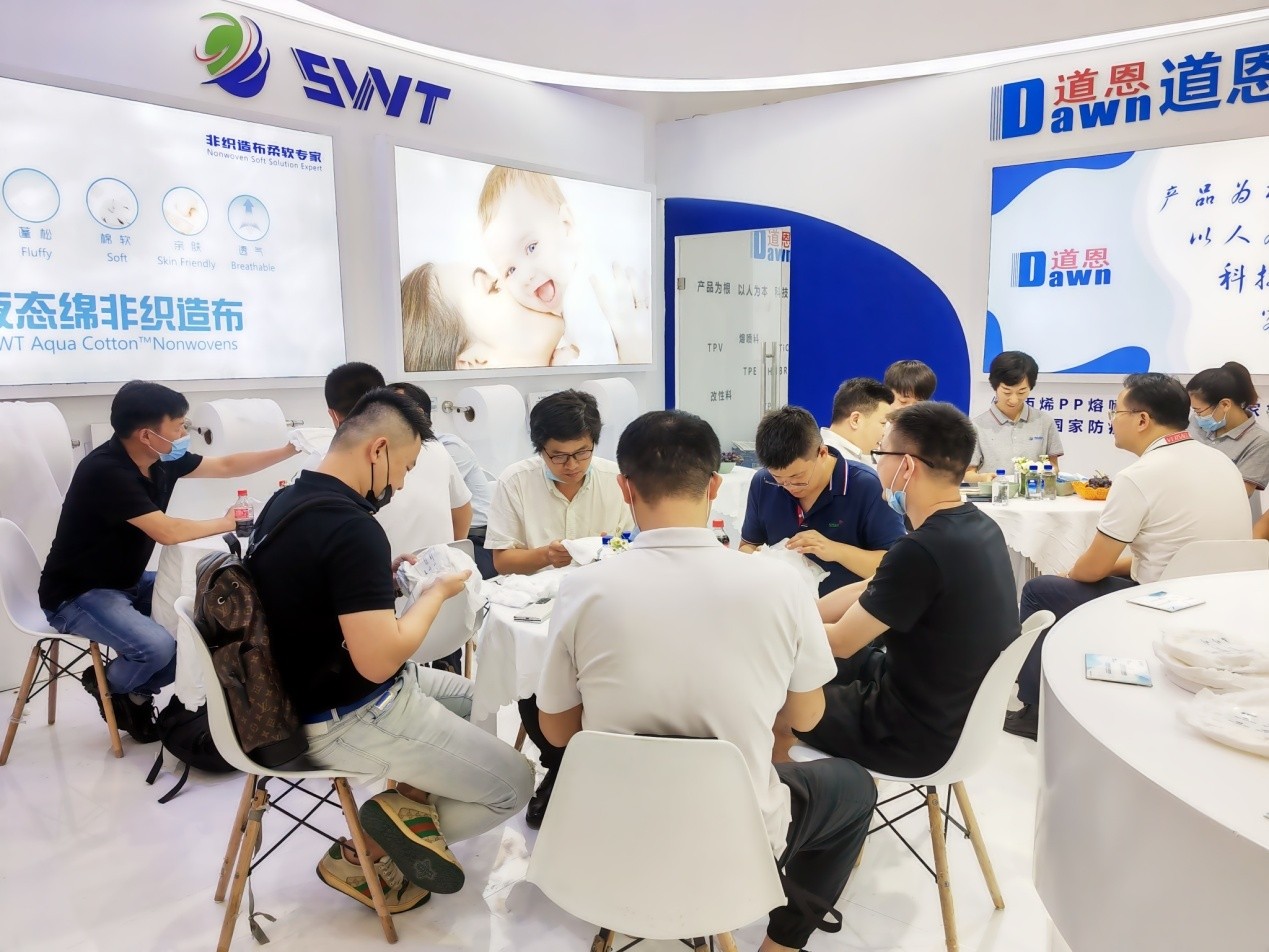 后疫情時代,非織造布價格競爭進入白熱化階段,但產品高端化、差異化需求旺盛。道恩斯維特公司總經理慎張飛介紹,公司緊盯行業前沿,研發推出了全新產品并列雙組份Premium 液態綿,具有超蓬松、高透氣、超柔軟、零刺激等特色,在拉拉褲腰圍應用中可以和紡粘非織造布隨意搭配,且不影響尿褲線的生產效率,成為展會又一大亮點。