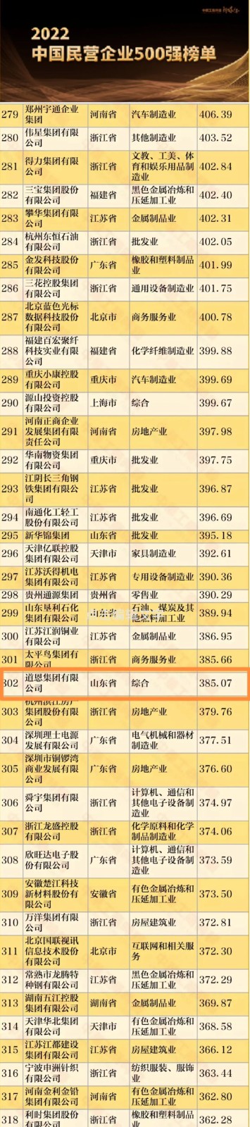9月7日上午,全國工商聯發布了2022中國民營企業500強榜單,集團公司憑借385.07億元營收位列302位,較去年提升29個位次,再創歷史新高,彰顯了企業的綜合實力和強勁的發展動力。