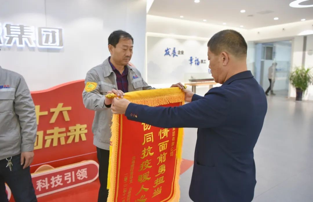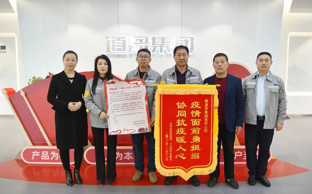 11月12日上午,龍口市龍港街道北皂前村黨總支書記姜思成,攜帶一面印有“疫情面前勇擔當、協同抗疫暖人心”字樣的錦旗和一封感謝信,走進道恩集團總部大樓,對該集團員工解立功、于麗麗在村居封控期間,參與抗疫志愿服務的愛心行動深表敬意和謝意。