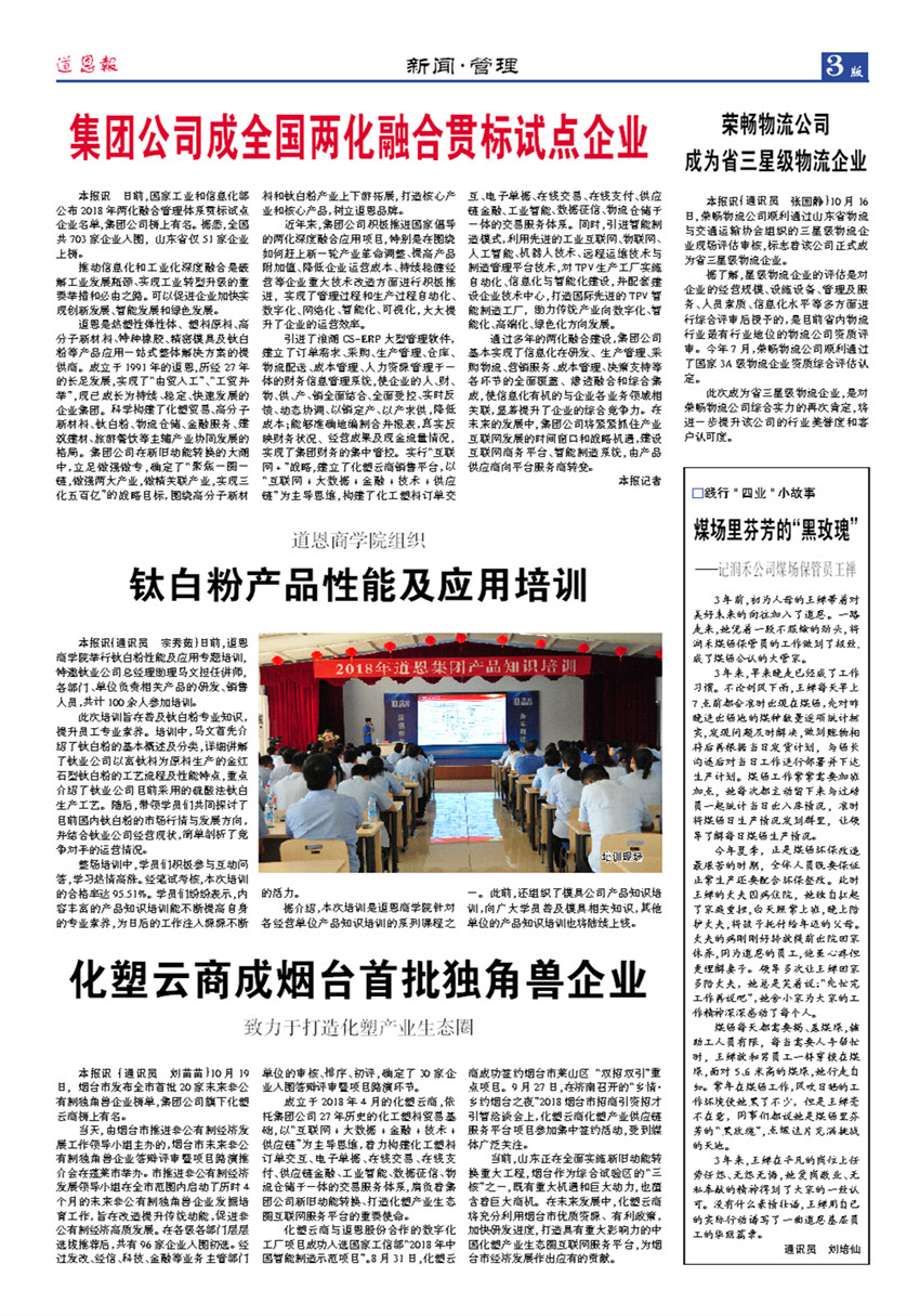 道恩集團始建于1991年,歷經多年探索和實踐,現已形成化塑貿易、高分子新材料、鈦白粉、現代物流、煤炭工貿、金融服務、其他產業等主輔產業協同發展的格局。2017年1月,道恩股份(股票代碼:002838)在深圳證券交易所上市。