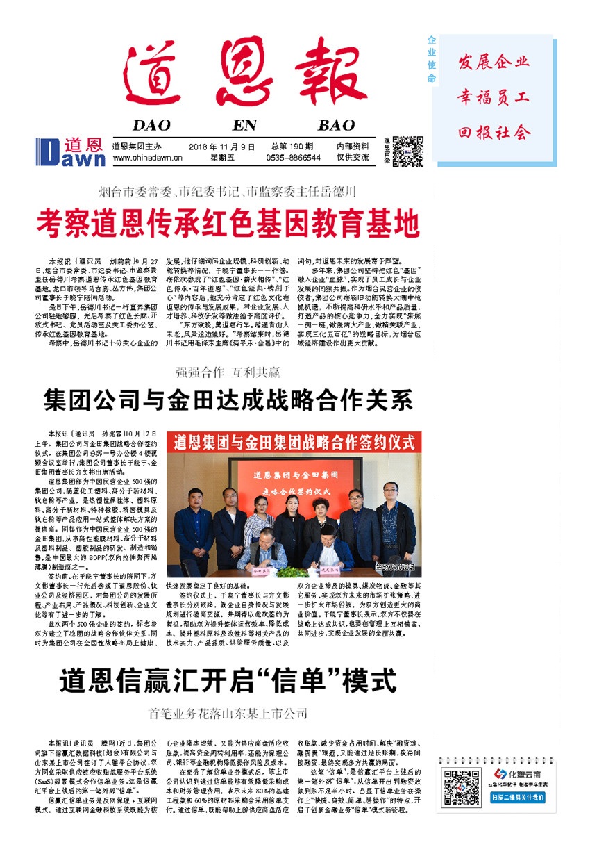 道恩集團始建于1991年,歷經多年探索和實踐,現已形成化塑云商、高分子新材料、鈦白粉、商貿物流、煤炭工貿、金融服務、其他產業等主輔產業協同發展的格局。2017年1月,道恩股份(股票代碼:002838)在深圳證券交易所上市。