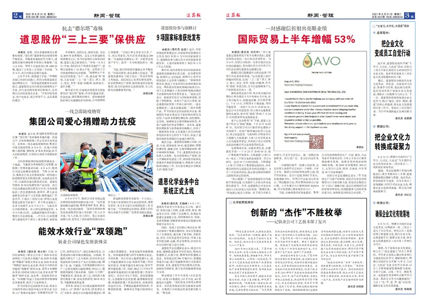 道恩集團始建于1991年,歷經多年探索和實踐,現已形成化塑貿易、高分子新材料、鈦白粉、現代物流、煤炭工貿、金融服務、其他產業等主輔產業協同發展的格局。2017年1月,道恩股份(股票代碼:002838)在深圳證券交易所上市。